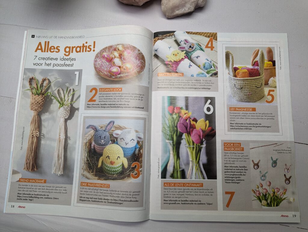 Wat ik écht heel gek vind, is dat er een hele sectie in zit, waarin verwezen wordt naar DUITSE patronen op websites met lange URL’s om over te typen. Alsof je daar als Nederlandse lezer op zit te wachten. Je wordt dan lekker gemaakt met bijvoorbeeld een leuk paasmandje, maar die kun je pas maken als je een Duitse website weet in te typen en dan een Duits haakpatroon weet te volgen. Daar koop je toch geen Nederlands haaktijdschrift voor?!