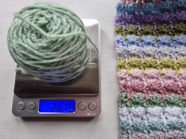 Ik gebruik een digitale weegschaal om te controleren hoe mijn garen wordt gebruikt terwijl ik door mijn deken werk – gewone digitale keukenweegschalen werken hiervoor prima, omdat je alleen een algemene meting in grammen nodig hebt. Ik kan deze zakweegschaal ook ten zeerste aanbevelen – ze zijn klein genoeg om in je garentas te stoppen en zijn een traktatie voor het wegen van garen. Je kunt degene die ik heb op Amazon vinden ((hier)).