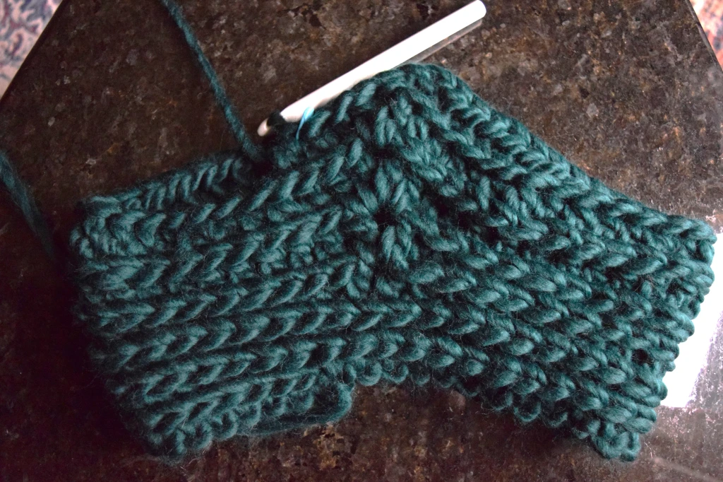Voor de capuchon in de foto hierboven heb ik Lion Brand Go For Faux Thick & Quick gebruikt voor de laatste toer van de capuchon en heb ik geen koordjes of rand gemaakt.