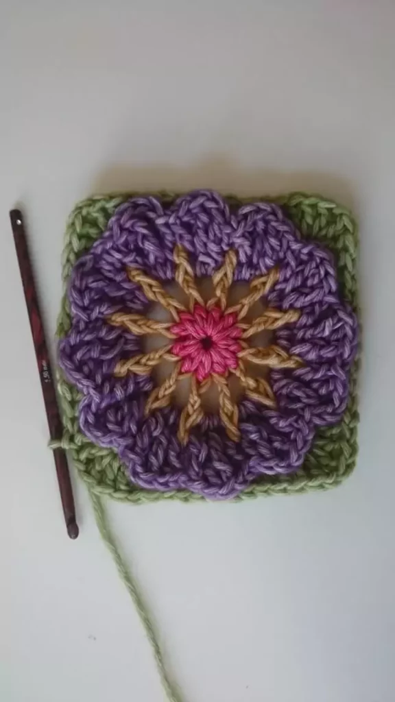 Toer 5: Hecht opnieuw kleur D (E, A, B) aan met een halvevaste om het eerste stokje van een 3-stokjesgroep van Toer 3. 3 lossen, reliëfdubbelstokje om dezelfde steek. (2 reliëfdubbelstokjes om het volgende stokje van ronde 3, (reliëfdubbelstokje, reliëfstokje) om het volgende stokje van ronde 3, (reliëfstokje, reliëfdubbelstokje) om het volgende stokje van toer 3) x 12, laatste 2 steken overslaan. Halvevaste bovenop derde beginlossen. Hecht af. (72 steken).