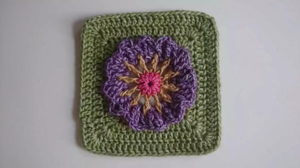 Deze granny square heet ‘Amazing Flower’, of ‘Prachtige Bloem’. Het is de tweede granny van week 3 en de vijfde granny van de Bloementuin Deken. Het is een middelgrote en vrij ingewikkelde granny van 20 bij 20 centimeter als je hem met het voorgeschreven materiaal maakt. De granny bestaat uit 8 toeren en 4 kleuren. Je maakt in totaal vier van deze vierkanten, in verschillende kleurencombinaties.