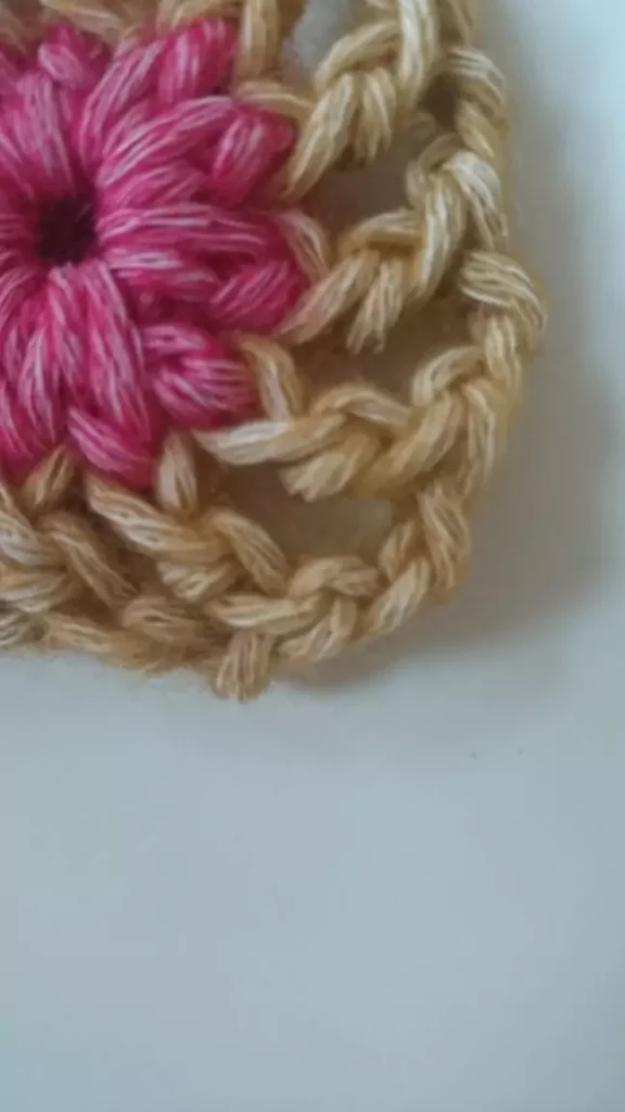 Toer 2: Hecht kleur A (B, C, D) aan met een halve vaste om een stokje van de vorige toer. 5 lossen (telt als stokje en 2 lossen). (Reliëfstokje om het volgende stokje, 2 lossen) x 11. Halvevaste op derde beginlosse. Hecht af. (12 reliëfstokjes, 12 2-lossenruimtes).