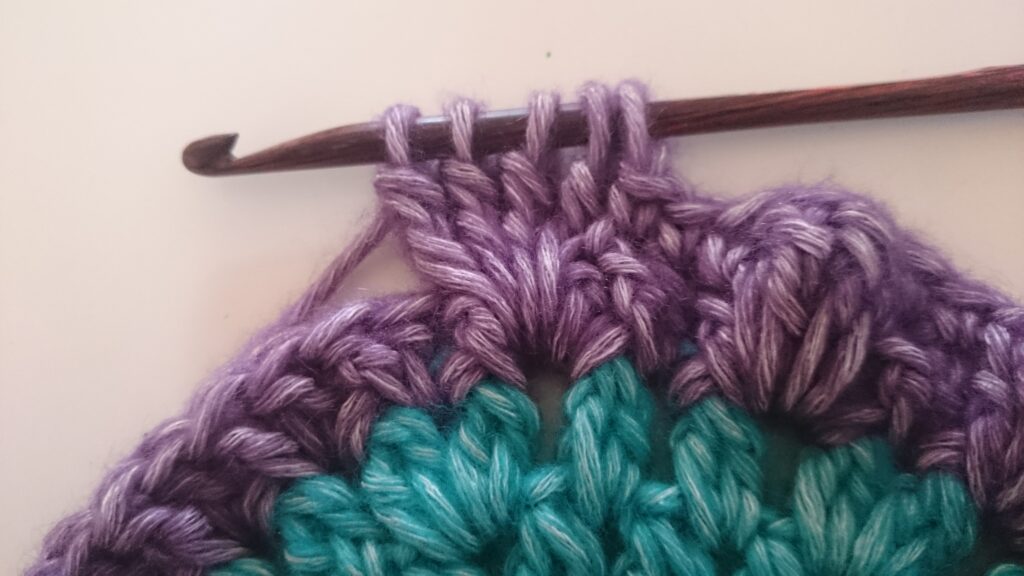 Toer 2: hecht met kleur B (C, D, E) aan in één van de lossenruimtes met een halve vaste. (Begin2stokjescluster, 1 losse, 2stokjescluster) in dezelfde ruimte, 1 losse. (2stokjescluster, 1 losse) x 2 in elke lossenruimte. Halve vaste bovenop de eerste begin2stokjescluster. [16 2stokjesclusters, 16 lossenruimtes]