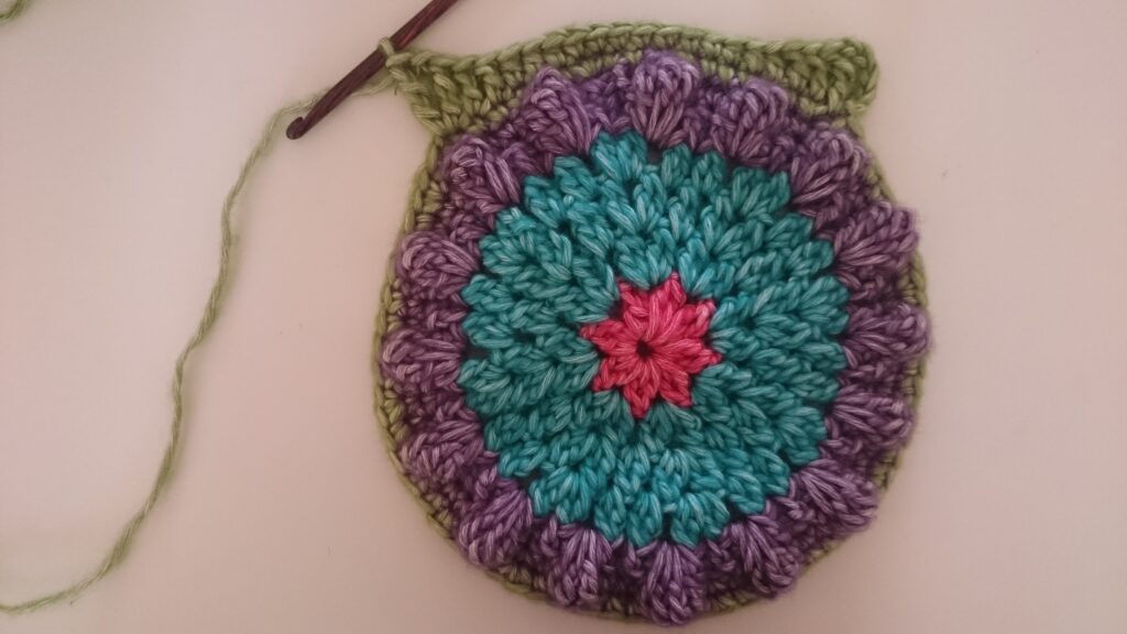 Het is een grote granny van 30 bij 30 centimeter als je hem met het voorgeschreven materiaal maakt. De granny bestaat uit 12 toeren.
