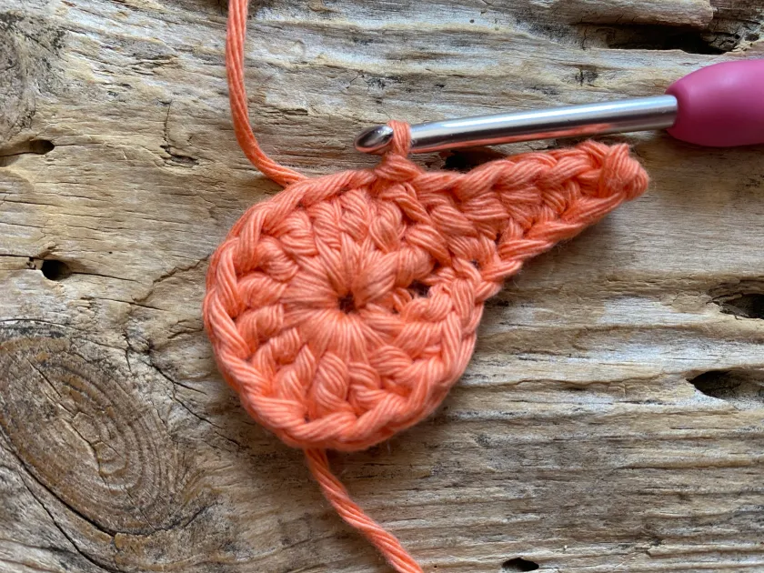 Toer 1: 3 lossen (telt als stokje), 14 stokjes in de ring, halve vaste in derde beginlosse. [15 steken]