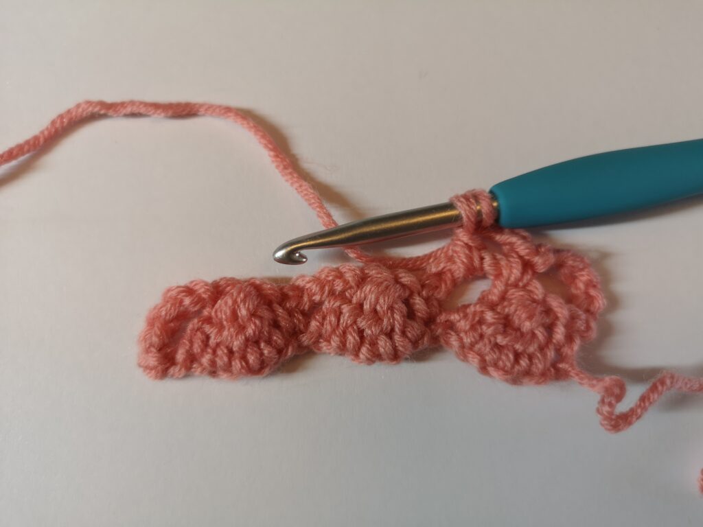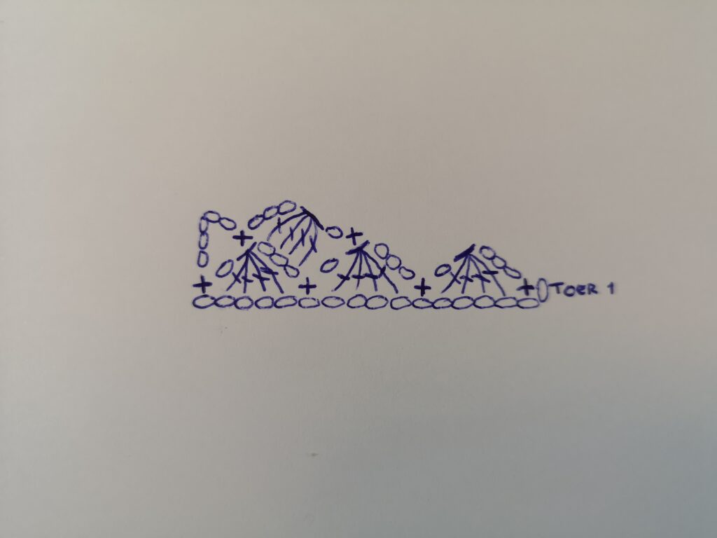 Toer 2: 5 lossen, 1 vaste in volgende cluster. *3 lossen, 4stokjescluster, 1 losse, vaste in volgende cluster. Herhaal vanaf * tot laatste boog van 3 lossen. 3 lossen, 4stokjescluster in laatste boog van 3 lossen, stokje in laatste vase, keer om.