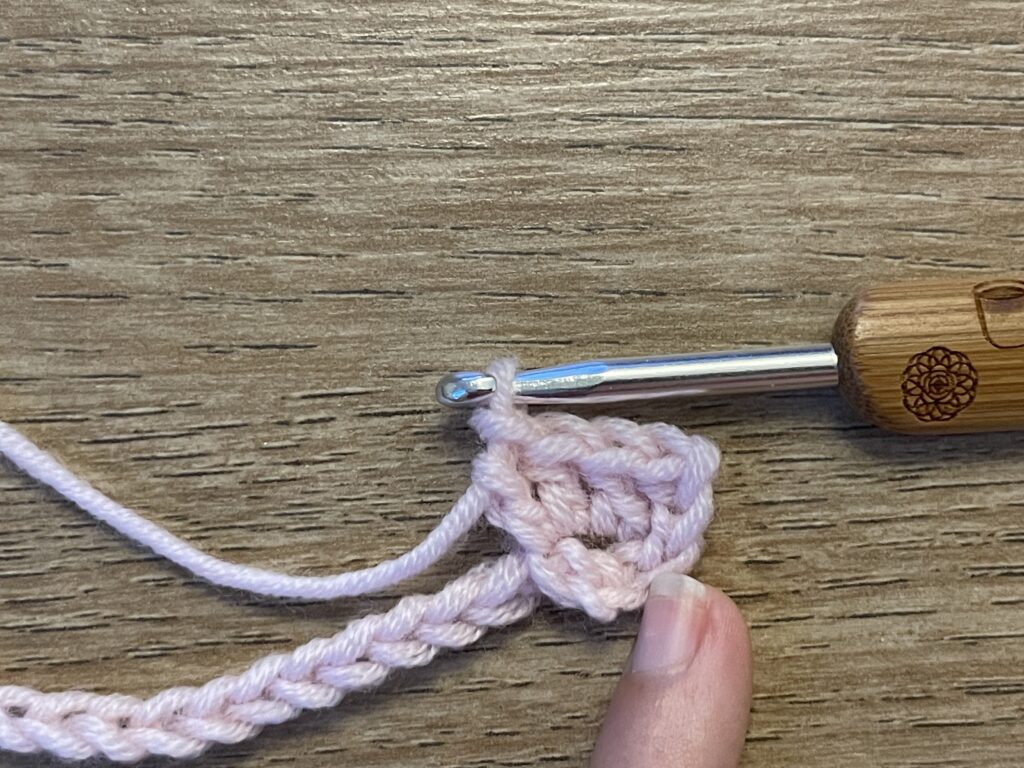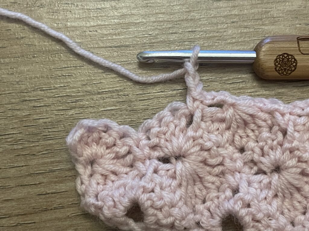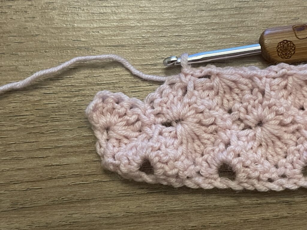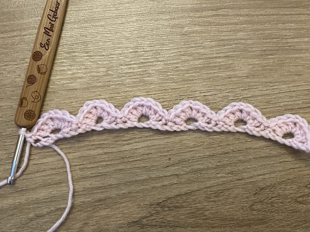 Toer 1: Haak een lossenketting die deelbaar is door 6 + 1 losse. Vaste in de 2e losse vanaf de haaknaald, *sla 2 lossen over, (3 stokjes, losse, 3 stokjes) in de volgende losse, sla 2 lossen over, vaste in de volgende losse* Herhaal * tot * tot einde toer.