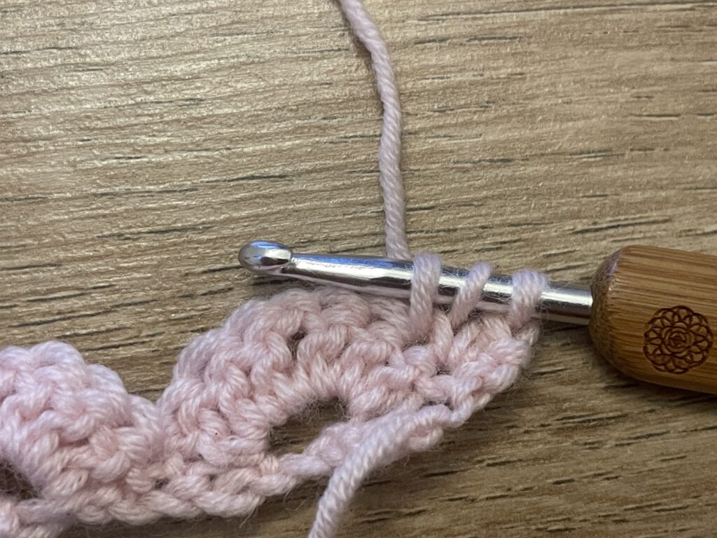 Toer 2: Losse, werk keren, stokje in dezelfde steek, 3samengehaaktestokjes, 3 lossen, vaste in lossenruimte. *2 lossen, 6samengehaaktestokjes waarbij je de vaste overslaat, 3 lossen, vaste in lossenruimte, * Herhaal van * tot * tot de laatste lossenruimte, 2 lossen, 3samengehaaktestokjes, stokje in laatste vaste.