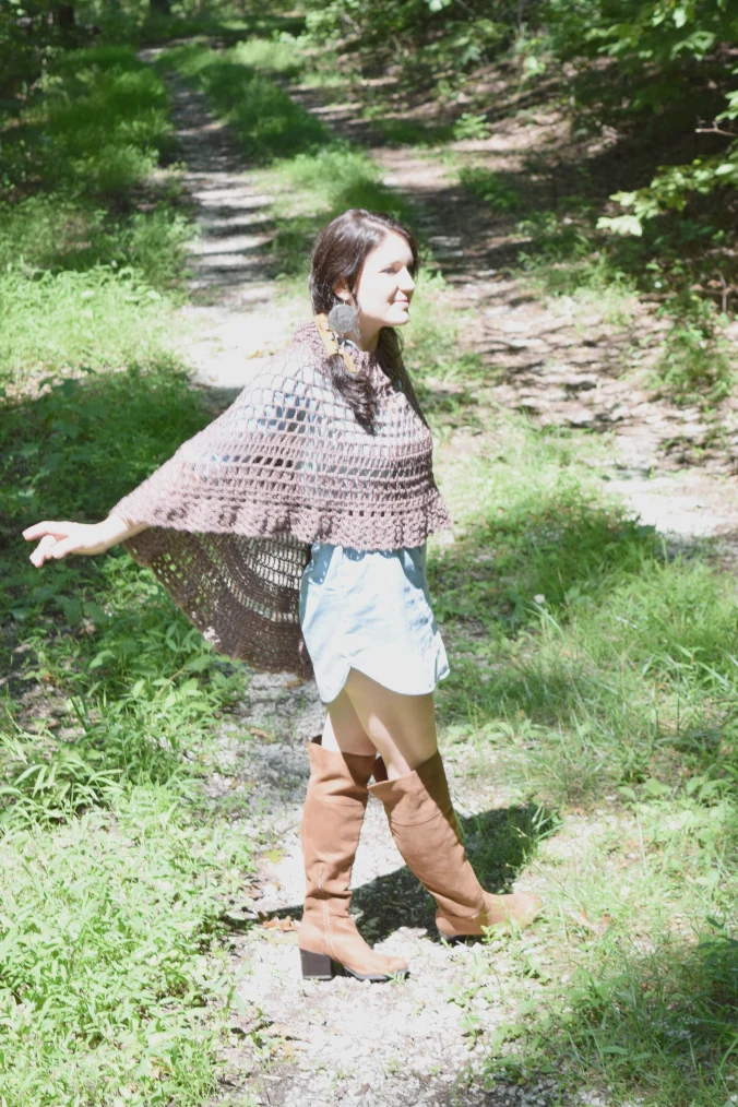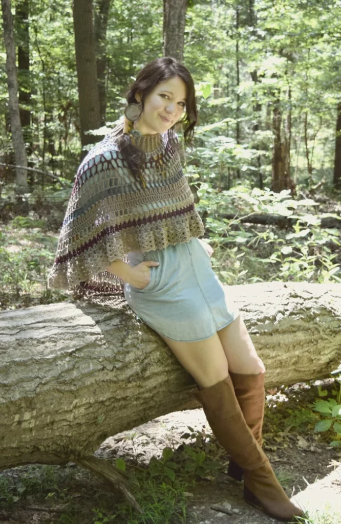 Een asymmetrische poncho gemaakt van zacht DK-gewicht garen houdt je behaaglijk EN stijlvol! De korte zoom aan de voorkant van de omslagdoek complimenteert alle figuren, terwijl de achterkant in zachte rimpelingen valt weg van een opvallend centraal kant-mandala-haakpatroon.