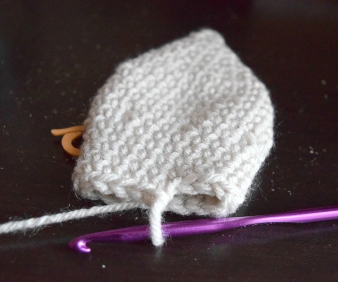 Toer 15: 2samengehaaktevasten over de volgende 2 steken, 2samengehaaktevasten over de volgende 2 steken. Als dit je eerste oorflap is, hecht je af. Als dit je tweede oorflap is, hecht je niet af.