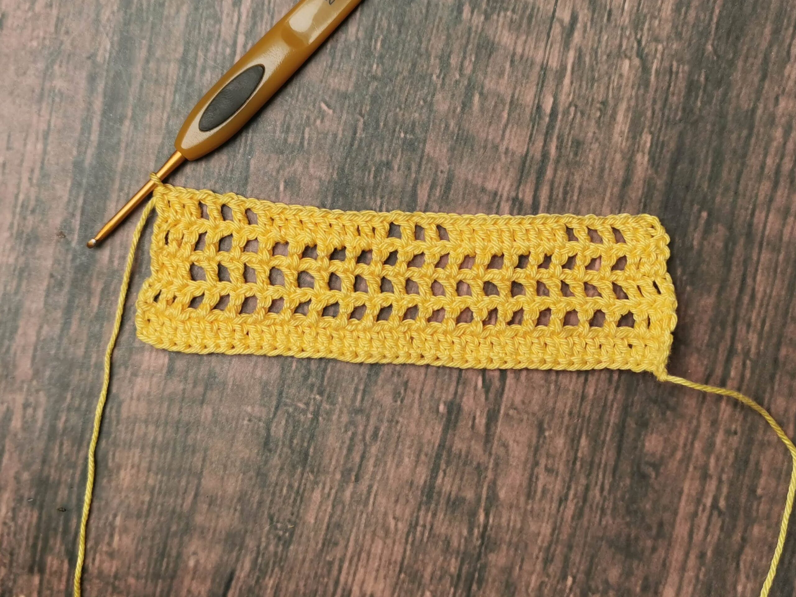 3 lossen (telt als eerste stokje), keer om. Stokje in de volgende 2 steken. *1 losse, 1 steek overslaan, 1 stokje* x 16, 1 losse, eindig met 1 stokje in elk van de laatste 3 steken. [22 stokjes]