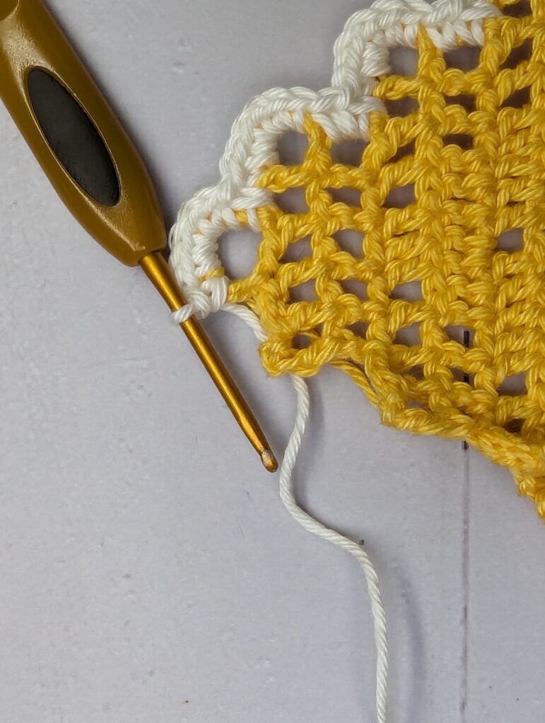 Toer 3: 2 lossen (telt als eerste halfstokje). Halfstokje in elk stokje en 10 halfstokjes in elke lossenboog.