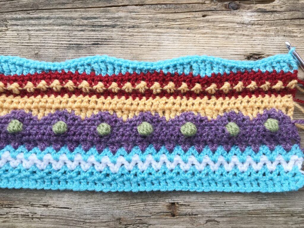 Kies weer de kleuren die je mooi vindt passen bij dit stukje van je deken, ik heb deze keer voor blauw- en groentinten gekozen. Dit is de “Lange Golf”-steek en hij lijkt op water en zee… Ik hou van deze stekencombinaties! Deel 4 is zo mooi geworden!