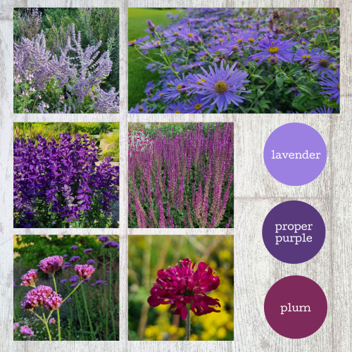 En tot slot Plum: dit is op zichzelf al zo’n mooie kleur, die toevallig matcht met verschillende bloemen in de late zomerborder. De foto hierboven toont de delicate bloemhoofdjes van een meerjarige verbena, maar er zijn nog veel meer paarse bloemen in de tuin.