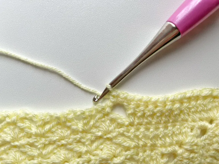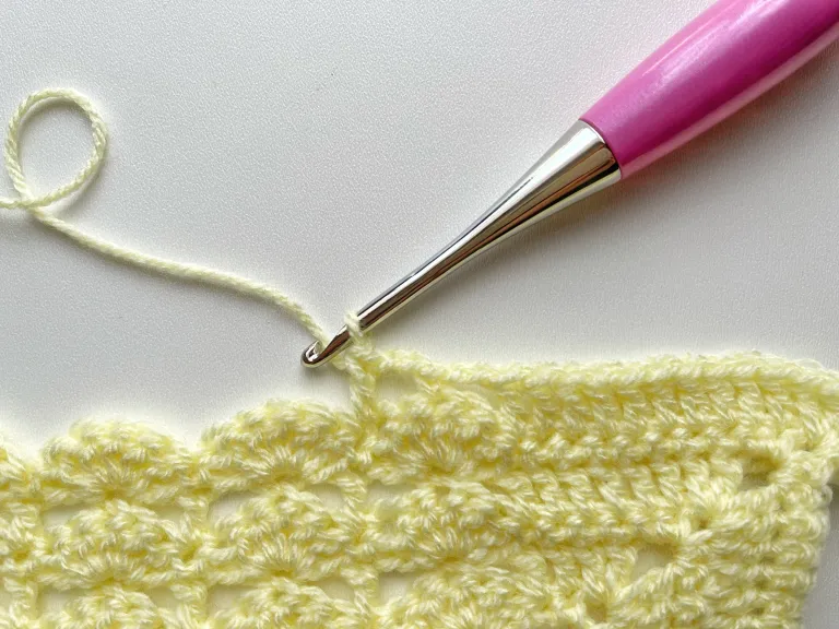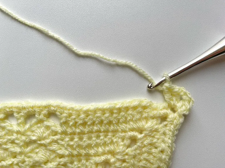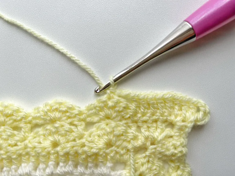 Hecht C7 (Lemon) aan in de goede kant in een willekeurige 2-lossenruimte met een (staand-stokje, 2 lossen, 2 stokjes) in een 2-lossen-hoekruimte (hoek gemaakt; foto 1). *1 Reliëfstokje-achter om elke steek van deze zijde (foto 2), (2 stokjes, 2 lossen, 2 stokjes) in hoekruimte (hoek gemaakt). Herhaal vanaf * 4 keer, laatste hoek instructies overslaan, stokje in eerste hoekruimte, halve vaste in eerste stokje.