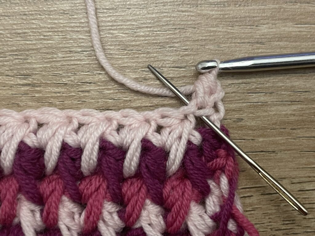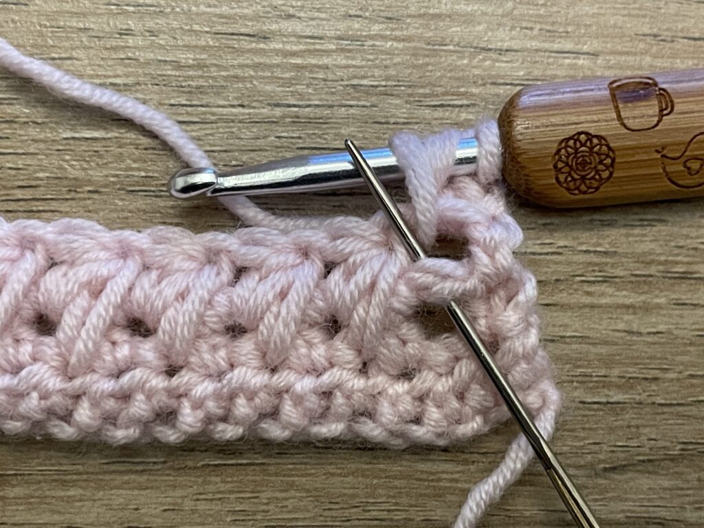 Stap 5: Losse en keer je werkStap 6: Halfstokje in het eerste halfstokje, dus waar de losse bovenop zit.Stap 7: Haak 1 losseStap 8: Sla het volgende halfstokje over, en haak verder in het volgende halfstokje, zoals aangegeven met de stopnaaldStap 9: Halfstokje in dit halfstokjeStap 10: Herhaal stap 7 t/m 9 tot einde toer